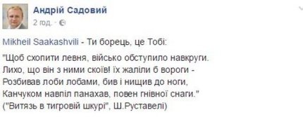 Мэр Львова Андрей Садовый написал "Михаил Саакашвили - ты борец" и сопроводил свою запись отрывком из поэмы "Витязь в тигровой шкуре" грузинского государственного деятеля и поэта Шота Руставели.