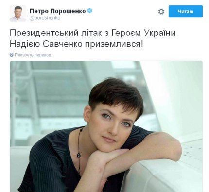 "Президентский самолет с Героем Украины Надеждой Савченко приземлился!" - написал глава государства.