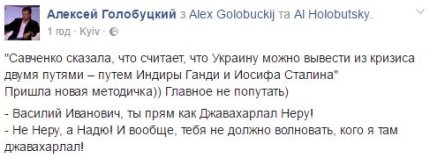 Отметим, что пользователи соцсетей высмеяли такие слова Савченко. В частности, политтехнолог Алексей Голобуцкий посмеялся над её путями разрешения проблем Украины: "Пришла новая методичка)) Главное не попутать)".