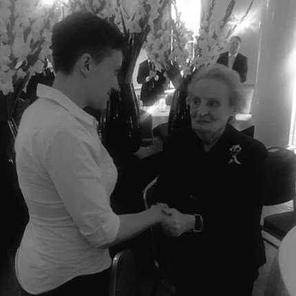 "Встреча Савченко с экс-госсекретарем США Мадлен Олбрайт на саммите НАТО в Варшаве", - подписал он обнародованный им снимок.