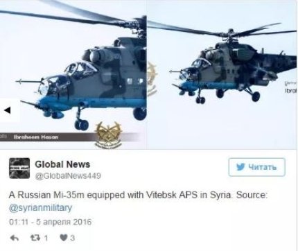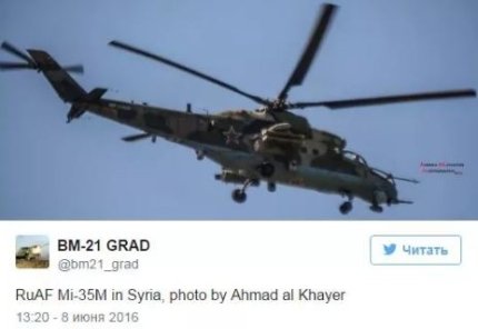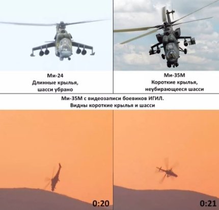 Также в Минобороны РФ заверили, что вертолет был сбит американской противотанковой ракетой TOW, которая имеется у террористов ИГИЛ. Эксперты Conflict Intelligence Team проанализировали видео и пришли к выводу, что сбитый около Пальмиры вертолет - не Ми-25, а новейший российский Ми-35, которого нет на вооружении сирийской армии, и он может быть исключительно российским. Другой вывод - есть основания говорить о том, что вертолет был сбит "дружественным огнем" еще одного российского вертолета, который летел сзади-сверху и занимался тем же, чем первый - продолжал огонь неуправляемыми ракетами по наземным целям.