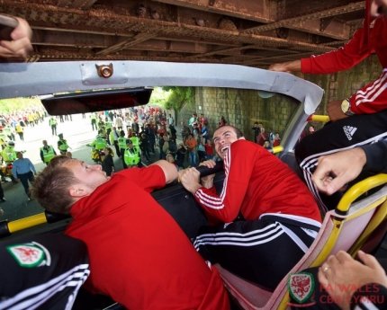 По дороге из аэропорта Кардиффа к стадиону "Кардифф Сити" футболисты ехали на автобусе с открытой крышей.
