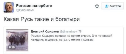 Пользователей сети насмешил образ Кадырова. Рогозин-на-орбите написал: "Какая Русь такие и богатыри".