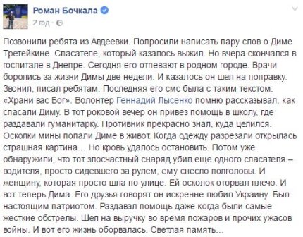 "Сегодня его отпевают в родном городе. Врачи боролись за жизни Димы две недели. И казалось он шел на поправку. Звонил, писал ребятам. Последняя его смс была с таким текстом: «Храни вас Бог», - написал Бочкала. - В тот роковой вечер он привез помощь в школу, где раздавали гуманитарку. Противник прекрасно знал, куда целился. Осколки мины попали Диме в живот. Когда одежду разрезали открылась страшная картина... Но кровь удалось остановить.