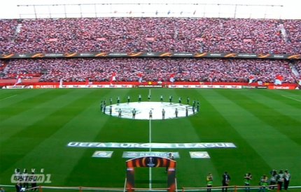 22:03. слушаем гимн Лиги Европы, но болельщики своим пением перекрикивают официальную музыку турнира