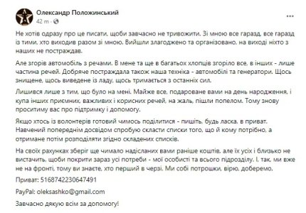Положинский обращает внимание на то, что почти полностью сгорели вещи батальона, которые им помогли закупить волонтеры.