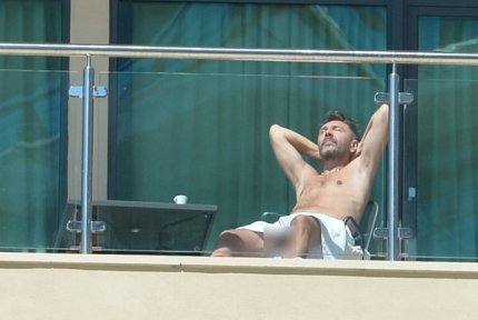 Но когда на балконе появилась супруга, явно не смог скрыть нежных чувств к ней, шутливо распахивая полотенце.