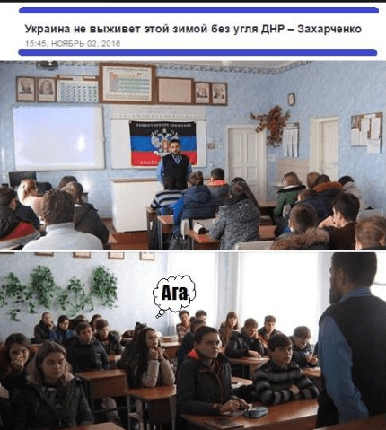 Так, пользователь Facebook под ником Свет Солнечный опубликовал фотожабу, сделанную на основе фото в одной из школ Донецка, которая осталась без отопления.