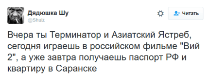 Кроме того, фолловеры сравнили голливудскую звезду с Жераром Депардье, получившим российское гражданство, и пообещали Арнольду квартиру в Саранске.