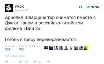 "Съемки с участием Шварценеггера проходят в Китае. Вместе с ним в фильме "Вий-2" снимается и другая звезда Голливуда Джеки Чан", — говорится в сообщении.