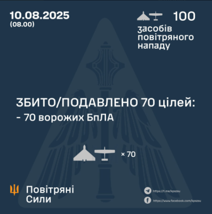 В течение ночи 9-10 августа российские захватчики совершали атаку 100 ударными БпЛА типа Shahed и беспилотниками-имитаторами разных типов. Благодаря слаженной работе сил ПВО удалось успешно обезвредить 70 вражеских целей.