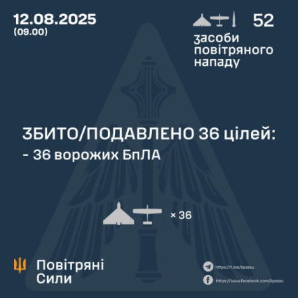В течение ночи 11 и 12 августа российские оккупанты осуществляли атаку на мирные города и села Украины 48 ударными БпЛА типа Shahed, беспилотниками-имитаторами разных типов, а также 4 баллистическими ракетами Искандер-М/KN-23. Силы ПВО сумели успешно обезвредить 36 вражеских целей.