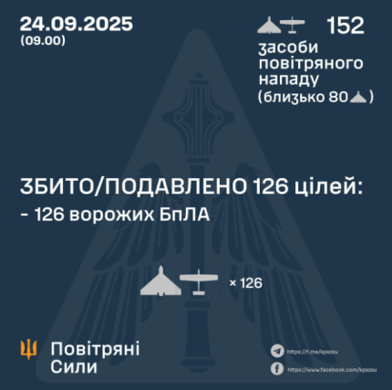 По предварительным данным, по состоянию на 09.00, противовоздушной обороной сбито/подавлено 126 вражеских БпЛА типа Shahed, Гербера и дронов других типов на севере, юге, востоке и центре страны.