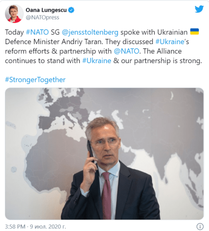"Сегодня генеральный секретарь НАТО Йенс Столтенберг говорил с украинским министром обороны Андреем Тараном. Они обсудили усилия Украины по реформированию и партнерство с НАТО. Альянс продолжает поддерживать Украину, и наше партнерство является сильным", - написала Лунгеску.