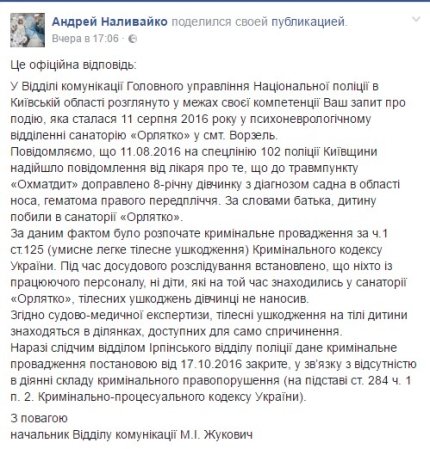 На запрос отца девочки Андрея Наливайко Главное управление Национальной полиции в Киевской области ответило, что дело закрыто, поскольку малышка наносила себе раны сама.