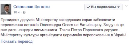 «Президент поручил Министерству иностранных дел обеспечить перевозку останков Александра Олеся на Родину. Согласие на это уже дали потомки писателя. Также Петр Порошенко поручил Министерству культуры организовать церемонию перезахоронения в Украине», - написал Цеголко.