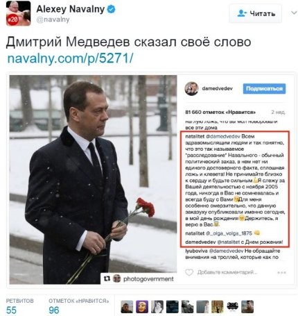 Подписчица Медведева написала, что расследование Навального – это обычный политический заказ.