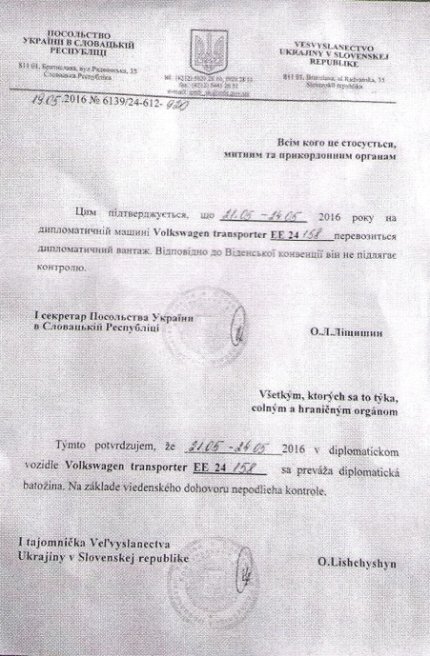 Отмечается, что в письме есть гербовая печать и подпись 1-го секретаря Посольства Украины Оксаны Лищишин. Адресат письма такой: «Всем кого это касается, таможенным и пограничным органам». И текст: «Этим подтверждается, что 21.05 - 24.05 2016 на дипломатической машине Volkswagentransporter EE 24158 перевозится дипломатический груз. Согласно Венской конвенции он не подлежит контролю».