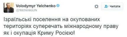 "Израильские поселения на оккупированных территориях противоречат международному праву как и оккупация Крыма Россией!", - написал Ельченко.