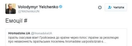 В то же время, постоянный представитель Украины при ООН Владимир Ельченко назвал в Twitter реакцию израильской стороны "эмоциональной" и сравнил строительство Израилем поселений в Палестине с аннексией украинского Крыма Россией.
