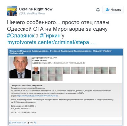 В сети утверждают, что якобы отец новоназначенного главы Одесской областной государственной администрации Максима Степанова Владимир Степанов, в прошлом депутат городского совета Славянска, содержится в базе сайта «Миротворец» в качестве пособника оккупантов.