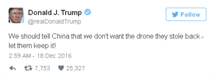 «Мы должны сказать Китаю, что не желаем возвращения похищенного ими дрона – пускай оставляют себе», - написал Трамп.