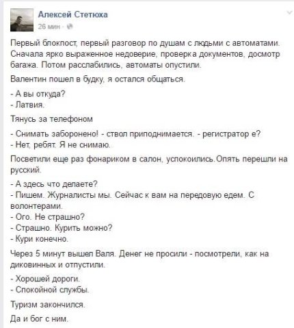 «Два этнических русских журналиста из Латвии, Валентин Роженцов и Алексей Стетюха сейчас оформляют аккредитацию в зону АТО. По инсайдерской информации, вопрос уже решен. Внимание вопрос - они там действительно нужны?» — написал он.