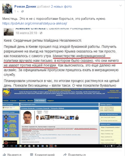 Еще через некоторое время Доник написал: «Я поздравляю всех выдавших аккредитацию и помогающих человеку который заслуженно находится в базе пособников террористов».
