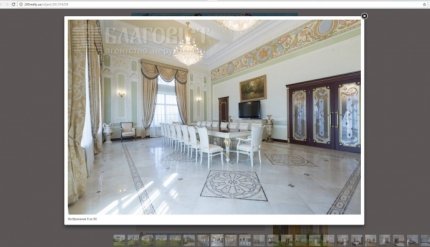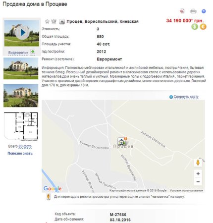 «Цена на сайте: 34 190 000* грн или 1 300 000$. Описание на сайте: Общая площадь: 580 кв м. Полностью меблирован итальянской и английской мебелью, люстры Чехия, бытовая техника Smeg. Роскошный дизайнерский ремонт в классическом стиле с использование дорогих материалов. Дом очень теплый и уютный. Мраморные полы с подогревом, Италия. Паркет Германия. Участок с красивым дизайнерским ландшафтным дизайном, много экзотических деревьев. Гостевой дом 170 м, дом охраны 18 м», - продолжил Ткач.
