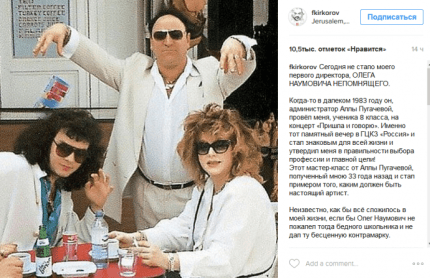 О смерти звездного директора 90-х сообщил поп-король российской эстрады в своем микроблоге. Филипп опубликовал архивное фото, на котором изображен он с Пугачевой и Непомнящим.