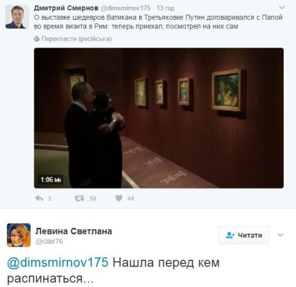 Журналист кремлёвского пула Дмитрий Смирнов опубликовал в сети видео, на котором запечатлено, как Путину в Третьяковской галерее показывают шедевры Ватикана, о передаче которых для выставки президент РФ договаривался в рамках визита в Рим. "Теперь приехал, посмотрел на них сам", - написал Смирнов.