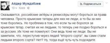 "Оказывается, российские актёры и режиссёры могут бороться за права человека. Просто крымские татары для них не люди, а то бы за них тоже боролись. Но проблема в том, что если ты не боролся за крымских татар, считая их не людьми, то теперь уже поздно бороться и за русских. Их тоже не помилуют. Они ведь тоже не люди. Вы не заметили, что, переступив через людей "второго сорта", вы сами стали людьми второго сорта? Нет? Ну, тогда ещё чуть-чуть подождите", - Айдер Муждабаев.