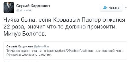 Так, пользователь Серый Кардинал пошутил, что после участия секретаря Совета национальной безопасности и обороны Украины Александра Турчинова в посвященном ветеранам АТО флешмобе #22pushupchallenge он предчувствовал, что в России что-то случится.