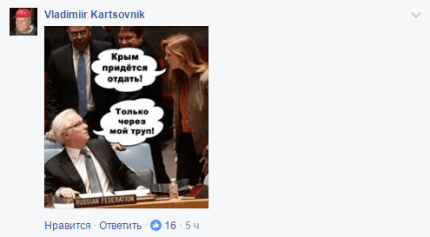 "«Детей в Сирии посыпают пылью, чтобы выдать их за жертв бомбёжек». «Мы налагаем вето на резолюцию Совбеза ООН о создании международного трибунала по Боингу МН-17». «Российских военных в Украине нет». «Крым провёл честный референдум». Ну и х*й с ним", - написал он.
