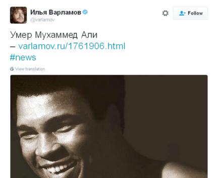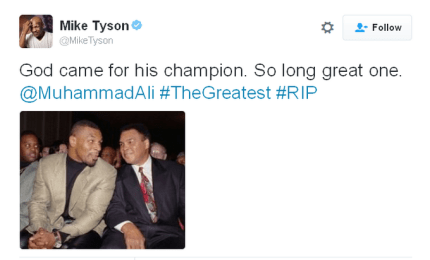 Отреагировали на смерть Мохаммеда Али и в социальных сетях. В частности, о его смерти написал другой знаменитый американский боксер Майк Тайсон в своем Twitter.