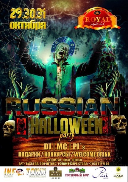 На картинке изображены черепа, обрамляющие надпись «Российский Хеллоуин», а также символическая фигура смерти в кокошнике.