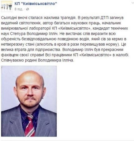 "Сегодня ночью произошла ужасная трагедия. В результате ДТП погиб выдающийся светотехник, автор многих научных трудов, начальник измерительной лаборатории КП «Киевгорсвет», кандидат технических наук Степура Владимир Ильич. Не хватает слов выразить всю возмущение безответственным поведением водителя, который сел за руль в нетрезвом состоянии (алкоголь в крови в разы превышал норму)", - говорится в сообщении.