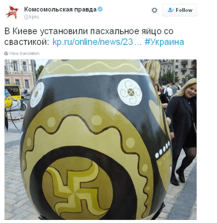 В частности, такие российские пропагандистские издания, как Комсомольская правда и LifeNews сообщили, что на пасхальном яйце, выставленном Киеве, изображен символ фашизма.