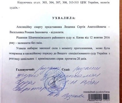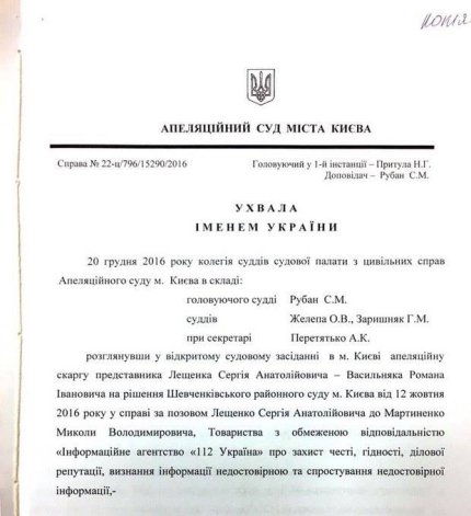 Депутат Верховной Рады Сергей Лещенко проиграл в апелляционном суде бывшему народному депутату Николаю Мартыненко. Киевский апелляционный суд подтвердил решение Шевченковского райсуда Киева о том, что Лещенко ежемесячно получает от российского олигарха Константина Григоришина 67 тыс. долл. плюс бонусы за дискредитационную кампанию против Мартыненко.