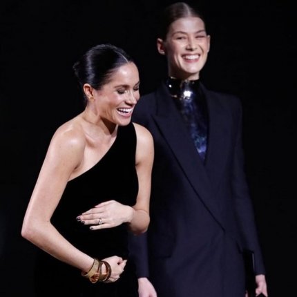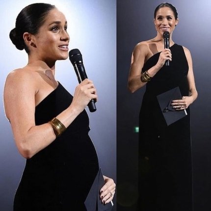 На сцене Меган Маркл появилась в облегающем черном платье от Givenchy и босоножках золотого цвета. Свой образ она дополнила золотым браслетом Pippa Small. Поклонники королевской семьи считают, что все в наряде Меган Маркл было идеальным, кроме одной детали - маникюра. Ее ногти темного цвета критики назвали вульгарной оплошностью, несоответствующей королевскому протоколу.