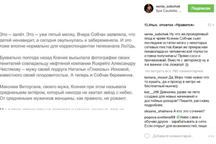 "Ну что же, прожорливый плод в чреве Ксении Собчак сьел последние остатки мозгa у некоторых сетевых глистов. Какая же прекрасная пинаколада из человеческой глупости и говна получилась! Прямо соси и причмокивай. Вместе с автором. Ну а я в винное спа ,пожалуй", - прокомментировала ведущая.