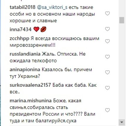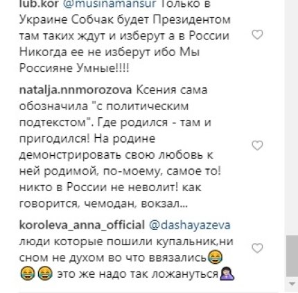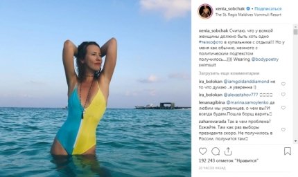 "Украина тоже вас очень любит", "Можно гражданство Украины дать", "Так и помаду нужно было желто-голубую. И купаться в Днепре", "Слава Україні!", "Спасибо, что не боитесь!", "Я ничего против не имею, но многие люди здесь правы: живете и делаете деньги в рашке, а сами за Украину", "А зачем надо было участвовать в выборах президента России? В Украине вон намечаются выборы, можно там подзаработать", "Достала! Лишить ее гражданства России", "Дякую за фото!) і за купальник) Слава здравомислячим людям, таким як Ви!", "И этот человек баллотировался в президенты РФ?", "Если бы в России было больше таких умных людей, как Собчак, то и россия была бы нормальной страной и тысячи людей остались живыми", "Да уж. И эта женщина хотела стать нашим президентом. Позор!", - комментируют купальник Собчак с "политическим подтекстом" в соцсети.