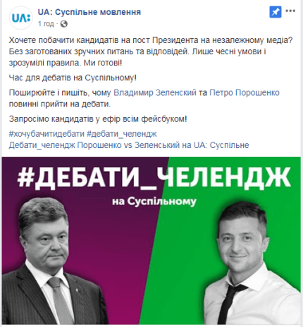 "Хотите увидеть кандидатов на пост Президента на независимом медиа? Без заготовленных удобных вопросов и ответов. Только честные условия и понятные правила. Мы готовы! Время для дебатов на Общественном! Распространяйте и пишите, почему Владимир Зеленский и Петр Порошенко должны прийти на дебаты. Давайте пригласим кандидатов в эфир всем фейсбуком!" – призывает "Общественное".