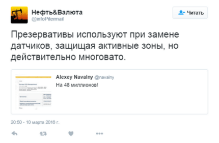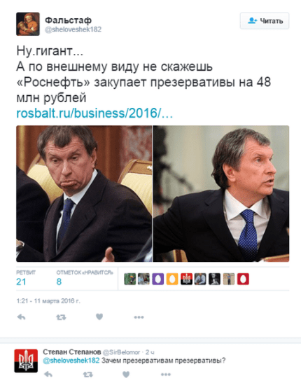 "Умом Россию не понять, пока не выпито ноль пять... компания Роснефть приобрела ПРЕЗЕРВАТИВЫ за 48 млн руб", - пишет в сети Focusnik_Evgeny.