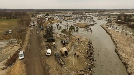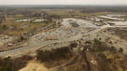Фотографии сняты беспилотником в селе Кухитская Воля в Ровенской области. На снимках можно рассмотреть используемую спецтехнику: трактора, экскаваторы, мотопомпы, десятки военных грузовиков.