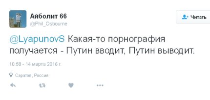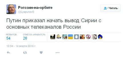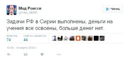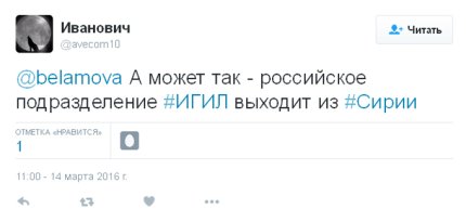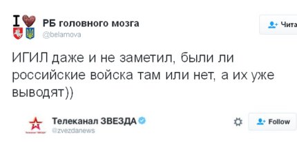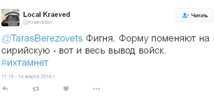 Еще один пользователь twitter Сергей Гурьянов отмечает: "Трюк с "выводом войск", есть только трюк, и ничего более. Что-нибудь выведут. Взамен усилят кораблей группировку в Средиземном море. Плюс стратеги чаще бомбить будут".