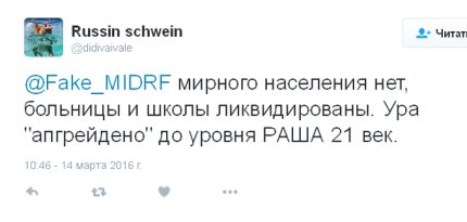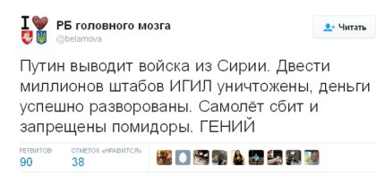 Так, пользователь twitter Ходорковский.ру недоумевает: Путин: «Задачи поставленные перед Минобороны, в целом выполнены». Какие задачи? ИГИЛ повержен? Где ждать следующую бессмысленную войну?".