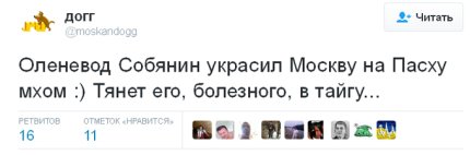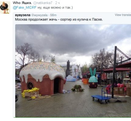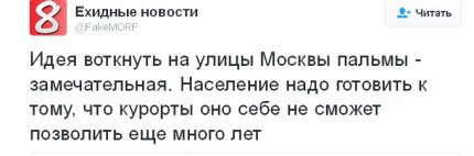 Другой журналист, Иван Яковина, который ныне проживает в Украине, в Facebook оценил оформление своей родной Москвы так: «В целом ничего такого ужасного нет. Я почему-то уверен, что режим рухнет в тот момент, когда уровень абсурда, набегающий сейчас по экспоненте, пробьет потолок. Вот пальмы на Театральной, зеленые монстры на Пушке - это из этой серии. Когда на пальме будет сидеть мэр и, исполняя арию Годунова, кидаться в людей пармезаном, то знайте: счастье близко».