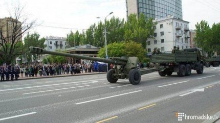После марша в центре города проехалась военная техника: БТР, гаубицы, танки Т-72, минометы, которые должны быть удалены от линии соприкосновения на 30 и 15 км соответственно. Также на параде 9 мая в колонны с техникой войдут реактивные системы залпового огня "Град".