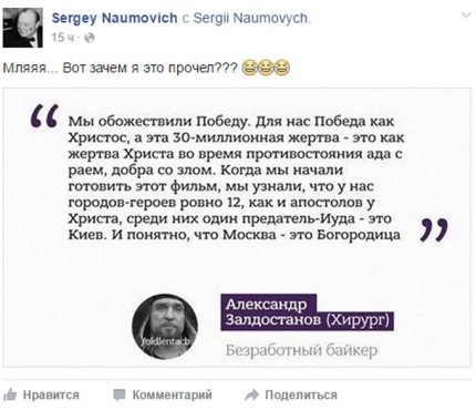 "Мы обожествили Победу. Для нас Победа как Христос, а эта 30-миллионная жертва - это как жертва Христа во время противостояния ада с раем, добра со злом. Когда мы начали готовить этот фильм (фильм о байк-шоу в оккупированном Севастополе - ред.), мы узнали, что у нас городов-героев ровно 12, как и апостолов у Христа, среди них один предатель-Иуда - это Киев. И понятно, что Москва - это Богородица", - заявил он.